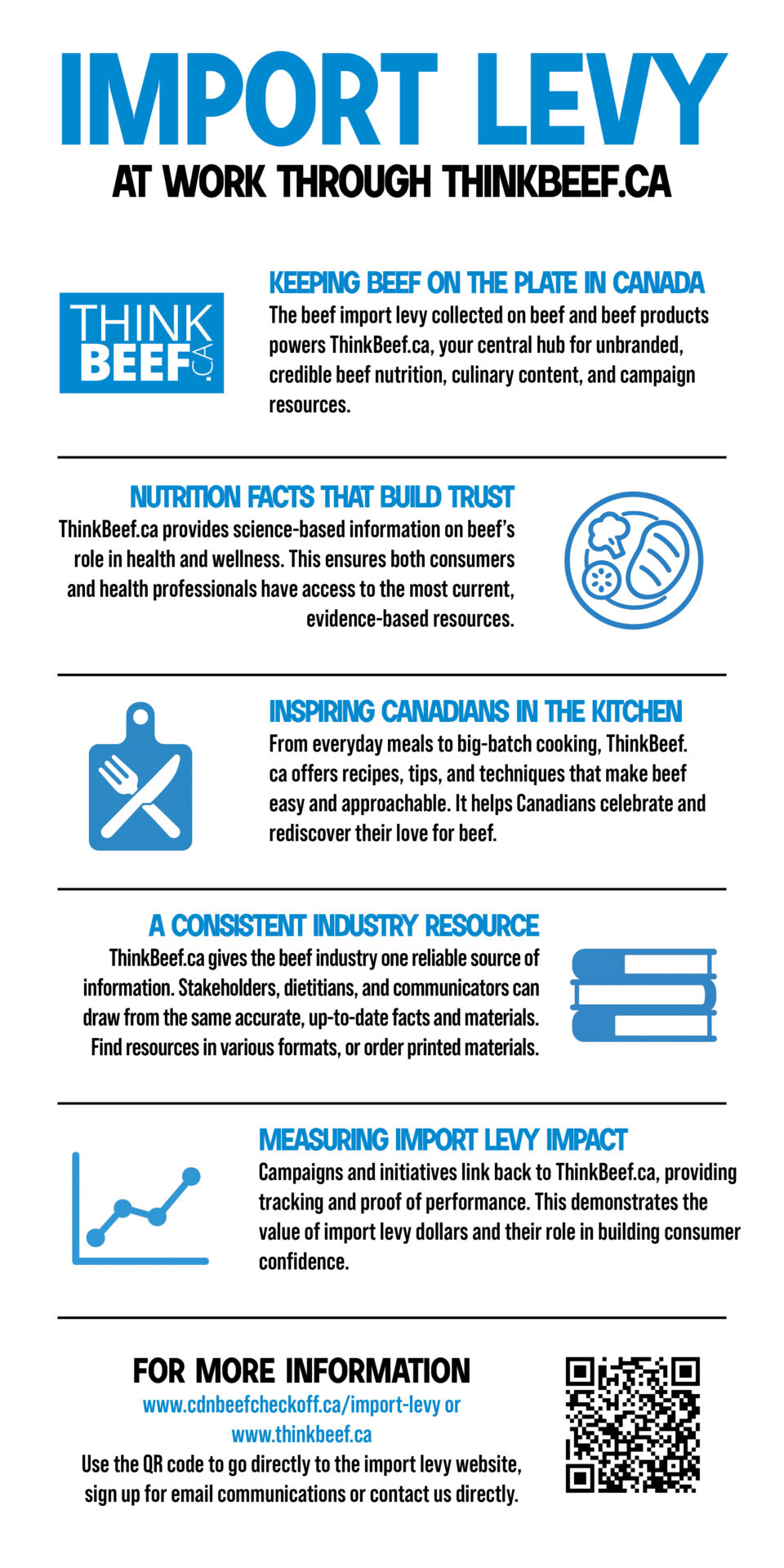 The strategic value of ThinkBeef lies in how it combines credibility, reach, and accountability. For consumers, it is a reliable source of inspiration and reassurance about the role of beef in a balanced diet. For health professionals, it offers evidence they can confidently integrate into their own nutrition messaging. For the beef industry, it is proof that levy dollars are being invested into programming that drives real outcomes. By acting as both a communications platform and a reporting mechanism, ThinkBeef underscores the transparency and value of import levy investments. In short, ThinkBeef.ca is more than just a website. It is a unifying voice for beef in Canada, a place where Canadians can learn, share, and celebrate beef, and a direct example of how generic import-levy funds translate into meaningful, measurable impact across the value chain.