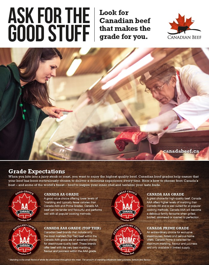The three grades highlighted represent approximately 97% of commercially graded beef production in Canada. The theme of the campaign, “Ask for the Good Stuff,” encourages consumers to look for the grade when buying Canadian beef. Understanding what beef grades represent will help consumers choose the product that is right for them and improve overall consumer satisfaction.