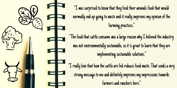 “I really love that how the cattle are fed reduces food waste. That sends a very strong message to me and definitely improves my impressions towards farmers and ranchers here.”
